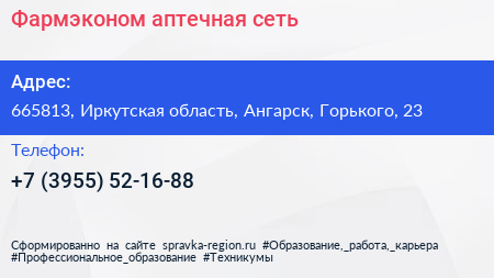 Фармэконом, аптечная сеть по адресу 665813, Иркутская область, Ангарск, Горького, 23 в дальнейшем Организация, размещена в следующих категориях: