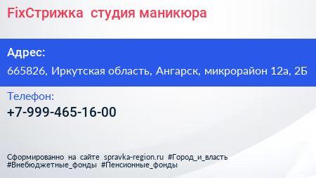 FixСтрижка+, студия маникюра по адресу 665826, Иркутская область, Ангарск, микрорайон 12а, 2Б в дальнейшем Организация, размещена в следующих категориях: