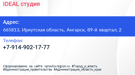 IDEAL, студия по адресу 665813, Иркутская область, Ангарск, 89-й квартал, 2 в дальнейшем Организация, размещена в следующих категориях: