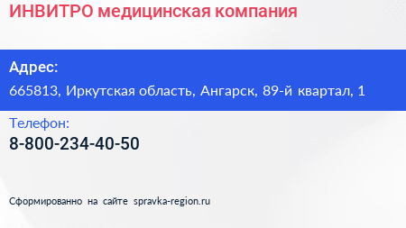 ИНВИТРО, медицинская компания по адресу 665813, Иркутская область, Ангарск, 89-й квартал, 1 в дальнейшем Организация, размещена в следующих категориях: