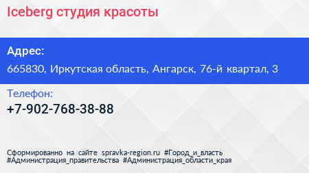 Iceberg, студия красоты по адресу 665830, Иркутская область, Ангарск, 76-й квартал, 3 в дальнейшем Организация, размещена в следующих категориях:
