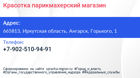 Красотка, парикмахерский магазин по адресу 665813, Иркутская область, Ангарск, Горького, 1 в дальнейшем Организация, размещена в следующих категориях: