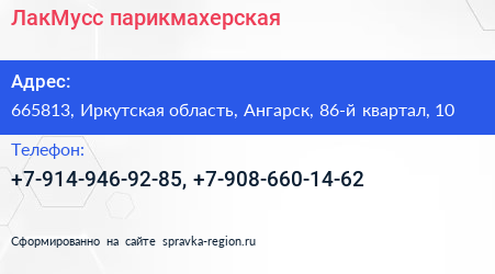 ЛакМусс, парикмахерская по адресу 665813, Иркутская область, Ангарск, 86-й квартал, 10 в дальнейшем Организация, размещена в следующих категориях: