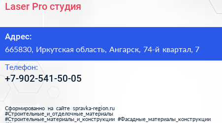 Laser Pro, студия по адресу 665830, Иркутская область, Ангарск, 74-й квартал, 7 в дальнейшем Организация, размещена в следующих категориях: