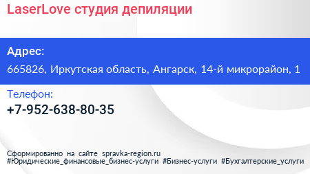 LaserLove, студия депиляции по адресу 665826, Иркутская область, Ангарск, 14-й микрорайон, 1 в дальнейшем Организация, размещена в следующих категориях: