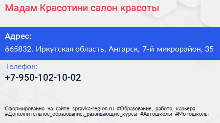 Мадам Красотини, салон красоты по адресу 665832, Иркутская область, Ангарск, 7-й микрорайон, 35 в дальнейшем Организация, размещена в следующих категориях: