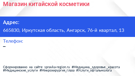 Магазин китайской косметики по адресу 665830, Иркутская область, Ангарск, 76-й квартал, 13 в дальнейшем Организация, размещена в следующих категориях: