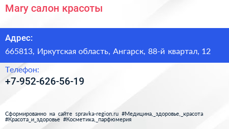 Mary, салон красоты по адресу 665813, Иркутская область, Ангарск, 88-й квартал, 12 в дальнейшем Организация, размещена в следующих категориях: