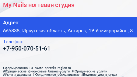 My Nails, ногтевая студия по адресу 665838, Иркутская область, Ангарск, 19-й микрорайон, 8 в дальнейшем Организация, размещена в следующих категориях: