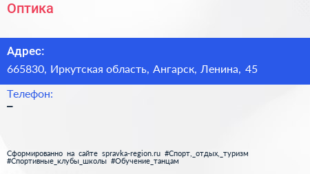 Оптика по адресу 665830, Иркутская область, Ангарск, Ленина, 45 в дальнейшем Организация, размещена в следующих категориях:
