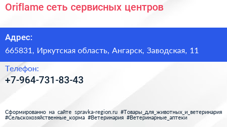 Oriflame, сеть сервисных центров по адресу 665831, Иркутская область, Ангарск, Заводская, 11 в дальнейшем Организация, размещена в следующих категориях: