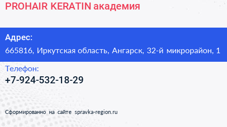 PROHAIR KERATIN, академия по адресу 665816, Иркутская область, Ангарск, 32-й микрорайон, 1 в дальнейшем Организация, размещена в следующих категориях: