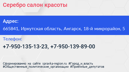 Серебро, салон красоты по адресу 665841, Иркутская область, Ангарск, 18-й микрорайон, 5 в дальнейшем Организация, размещена в следующих категориях: