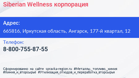 Siberian Wellness, корпорация по адресу 665816, Иркутская область, Ангарск, 177-й квартал, 12 в дальнейшем Организация, размещена в следующих категориях:
