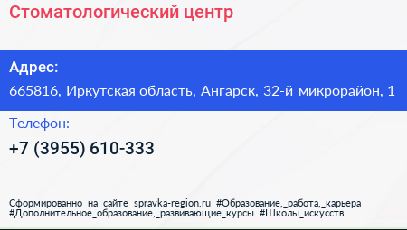Стоматологический центр по адресу 665816, Иркутская область, Ангарск, 32-й микрорайон, 1 в дальнейшем Организация, размещена в следующих категориях: