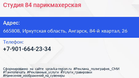 Студия 84, парикмахерская по адресу 665808, Иркутская область, Ангарск, 84-й квартал, 26 в дальнейшем Организация, размещена в следующих категориях:
