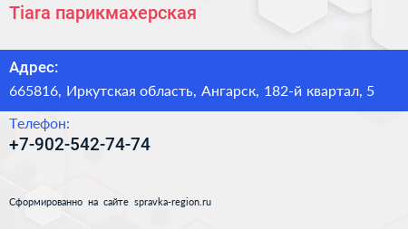 Tiara, парикмахерская по адресу 665816, Иркутская область, Ангарск, 182-й квартал, 5 в дальнейшем Организация, размещена в следующих категориях: