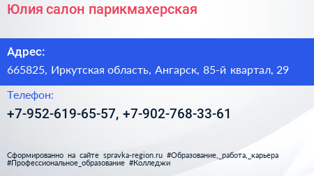 Юлия, салон-парикмахерская по адресу 665825, Иркутская область, Ангарск, 85-й квартал, 29 в дальнейшем Организация, размещена в следующих категориях: