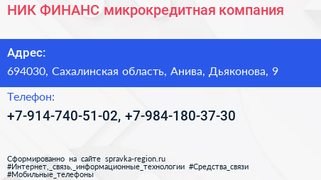 НИК ФИНАНС, микрокредитная компания по адресу 694030, Сахалинская область, Анива, Дьяконова, 9 в дальнейшем Организация, размещена в следующих категориях: