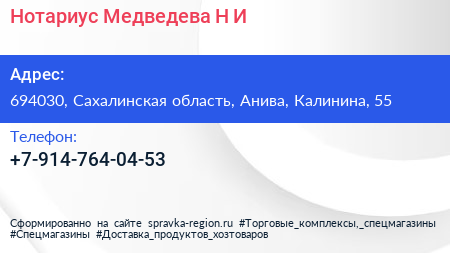 Нотариус Медведева Н.И. по адресу 694030, Сахалинская область, Анива, Калинина, 55 в дальнейшем Организация, размещена в следующих категориях:
