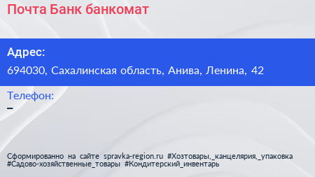 Почта Банк, банкомат по адресу 694030, Сахалинская область, Анива, Ленина, 42 в дальнейшем Организация, размещена в следующих категориях: