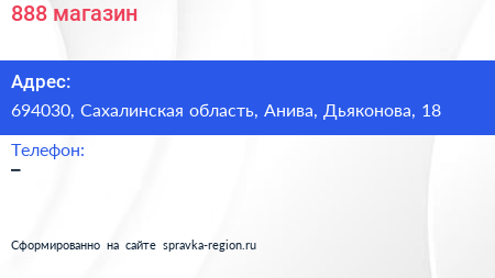 888, магазин по адресу 694030, Сахалинская область, Анива, Дьяконова, 18 в дальнейшем Организация, размещена в следующих категориях:
