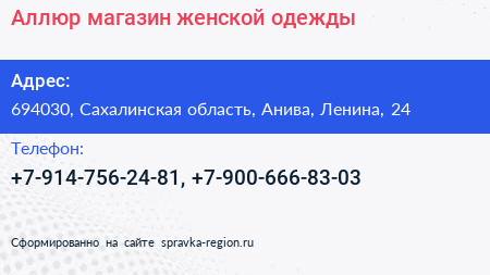 Аллюр, магазин женской одежды по адресу 694030, Сахалинская область, Анива, Ленина, 24 в дальнейшем Организация, размещена в следующих категориях: