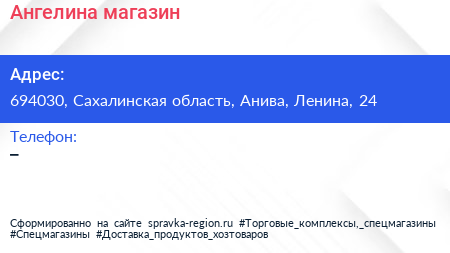 Ангелина, магазин по адресу 694030, Сахалинская область, Анива, Ленина, 24 в дальнейшем Организация, размещена в следующих категориях: