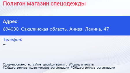 Полигон, магазин спецодежды по адресу 694030, Сахалинская область, Анива, Ленина, 47 в дальнейшем Организация, размещена в следующих категориях: