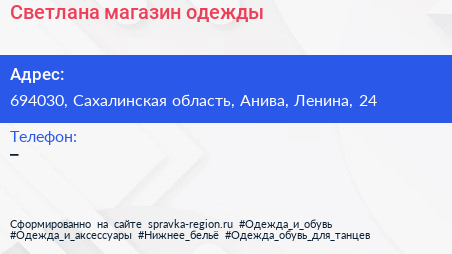 Светлана, магазин одежды по адресу 694030, Сахалинская область, Анива, Ленина, 24 в дальнейшем Организация, размещена в следующих категориях: