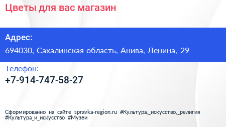 Цветы для вас, магазин по адресу 694030, Сахалинская область, Анива, Ленина, 29 в дальнейшем Организация, размещена в следующих категориях: