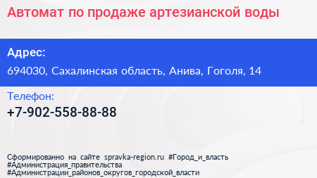 Автомат по продаже артезианской воды по адресу 694030, Сахалинская область, Анива, Гоголя, 14 в дальнейшем Организация, размещена в следующих категориях: