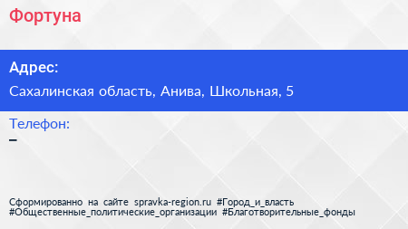 Фортуна по адресу Сахалинская область, Анива, Школьная, 5 в дальнейшем Организация, размещена в следующих категориях: