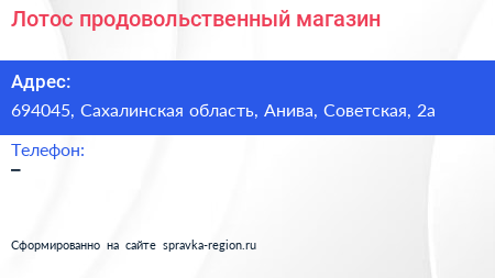 Лотос, продовольственный магазин по адресу 694045, Сахалинская область, Анива, Советская, 2а в дальнейшем Организация, размещена в следующих категориях: