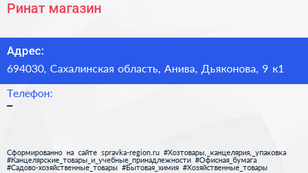 Ринат, магазин по адресу 694030, Сахалинская область, Анива, Дьяконова, 9 к1 в дальнейшем Организация, размещена в следующих категориях: