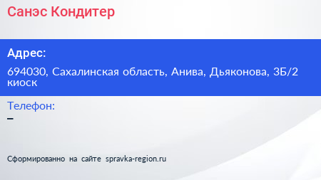 Санэс-Кондитер по адресу 694030, Сахалинская область, Анива, Дьяконова, 3Б/2 киоск в дальнейшем Организация, размещена в следующих категориях: