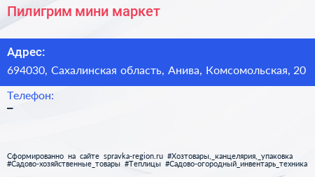 Пилигрим, мини-маркет по адресу 694030, Сахалинская область, Анива, Комсомольская, 20 в дальнейшем Организация, размещена в следующих категориях: