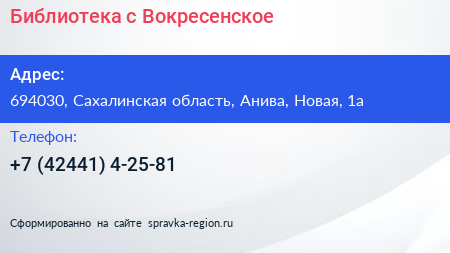 Библиотека, с. Вокресенское по адресу 694030, Сахалинская область, Анива, Новая, 1а в дальнейшем Организация, размещена в следующих категориях: