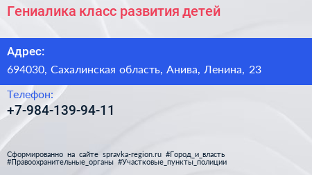 Гениалика, класс развития детей по адресу 694030, Сахалинская область, Анива, Ленина, 23 в дальнейшем Организация, размещена в следующих категориях: