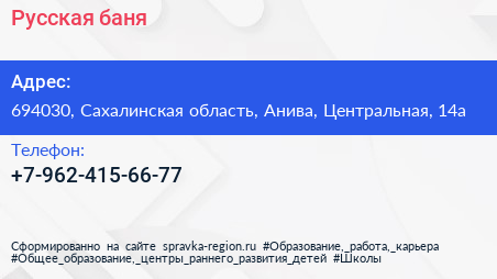 Русская баня по адресу 694030, Сахалинская область, Анива, Центральная, 14а в дальнейшем Организация, размещена в следующих категориях: