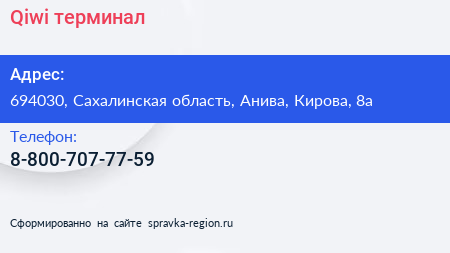 Qiwi, терминал по адресу 694030, Сахалинская область, Анива, Кирова, 8а в дальнейшем Организация, размещена в следующих категориях: