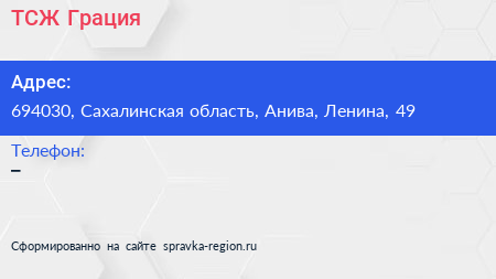 ТСЖ Грация по адресу 694030, Сахалинская область, Анива, Ленина, 49 в дальнейшем Организация, размещена в следующих категориях: