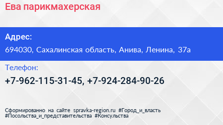 Ева, парикмахерская по адресу 694030, Сахалинская область, Анива, Ленина, 37а в дальнейшем Организация, размещена в следующих категориях: