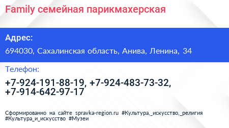 Family, семейная парикмахерская по адресу 694030, Сахалинская область, Анива, Ленина, 34 в дальнейшем Организация, размещена в следующих категориях: