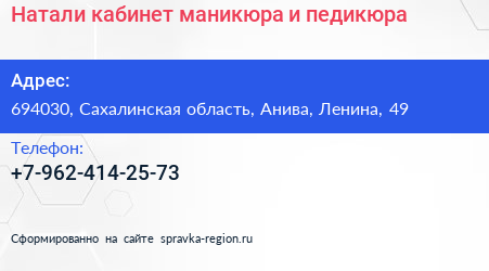 Натали, кабинет маникюра и педикюра по адресу 694030, Сахалинская область, Анива, Ленина, 49 в дальнейшем Организация, размещена в следующих категориях: