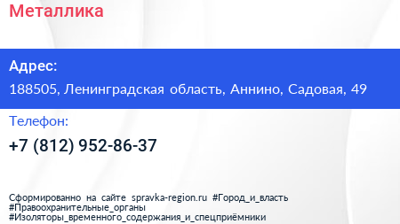 Металлика по адресу 188505, Ленинградская область, Аннино, Садовая, 49 в дальнейшем Организация, размещена в следующих категориях: