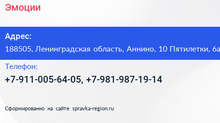 Эмоции по адресу 188505, Ленинградская область, Аннино, 10 Пятилетки, 6а в дальнейшем Организация, размещена в следующих категориях: