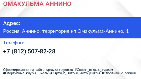 ОМАКУЛЬМА-АННИНО по адресу Омакульма-Аннино, Онежская улица, Омакульма-Аннино, Пески, Аннинское городское поселение, Ломоносовский район, Ленинградская область, Северо-Западный федеральный округ, 188505, Россия в дальнейшем Организация, размещена в следующих категориях: