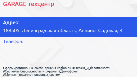 GARAGE, техцентр по адресу 188505, Ленинградская область, Аннино, Садовая, 4 в дальнейшем Организация, размещена в следующих категориях: