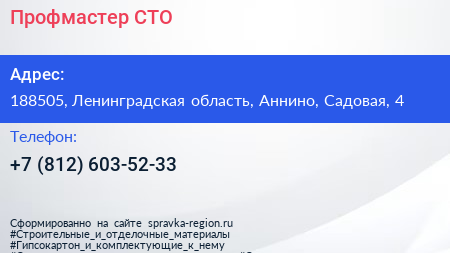 Профмастер, СТО по адресу 188505, Ленинградская область, Аннино, Садовая, 4 в дальнейшем Организация, размещена в следующих категориях: